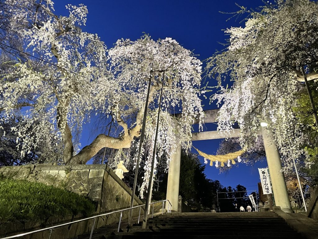 石の大鳥居のそばに咲くしだれ桜が灯りに浮かぶ姿は、静かでいて印象に残る風景です。
