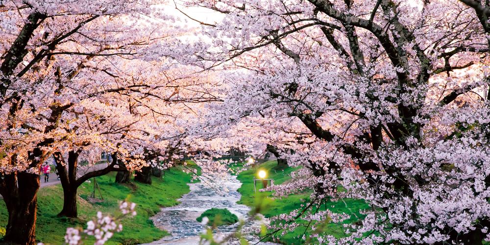 東北夢の桜街道・第11番札所にも数えられるこの場所は、ライトアップされた桜が川面に映り込む光景が特に美しく、昼間とはまったく異なる幻想的な雰囲気に包まれます。