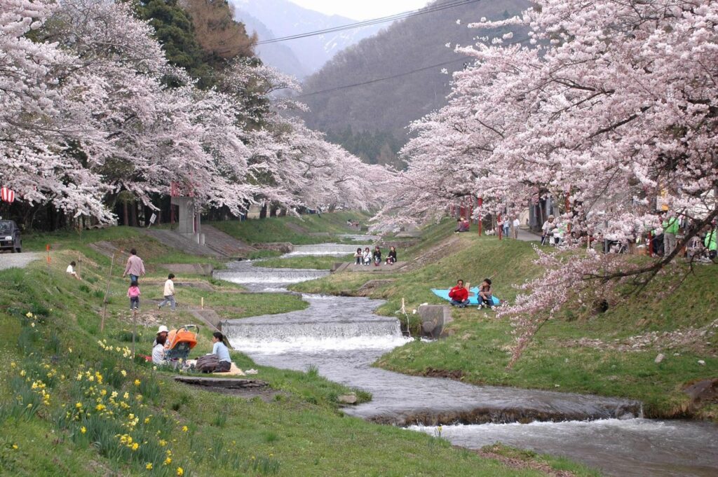 福島県猪苗代町を流れる観音寺川沿いに広がる、約1kmの桜並木。