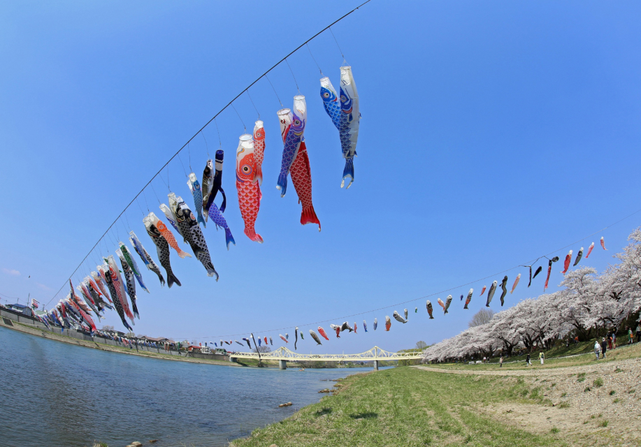 北上川の上を泳ぐこいのぼりは、桜と川と空が重なるこの場所ならではの景色。