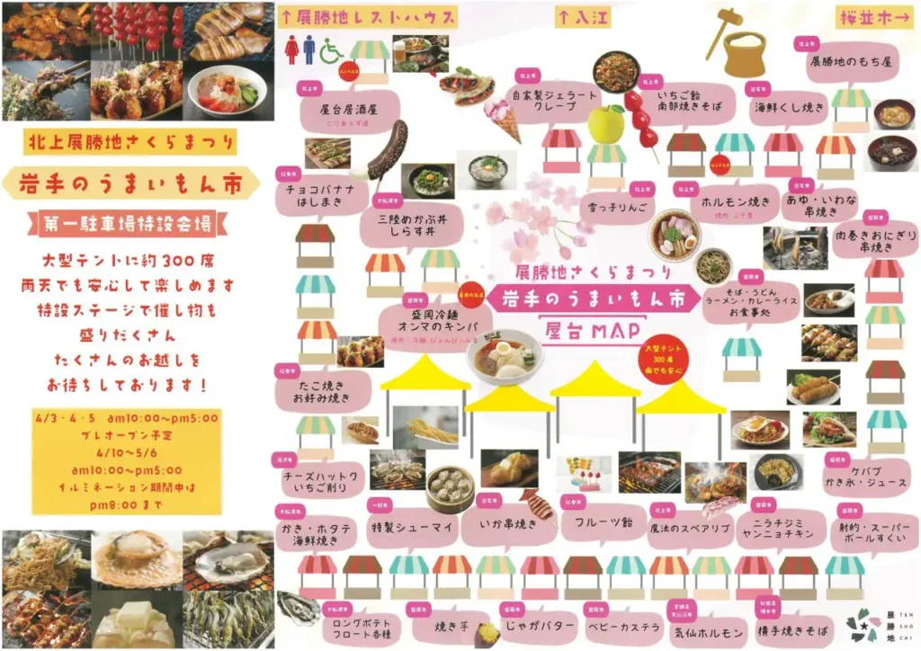 エリアとしては、「岩手のうまいもの市」が第一駐車場、キッチンカーが展勝地公園内という配置が予定されています。
