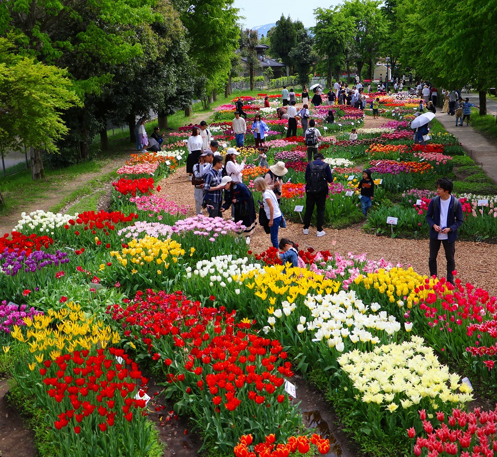会場は富山県砺波市の砺波チューリップ公園で、JR砺波駅から徒歩約15分、無料シャトルバスなら約5分です。