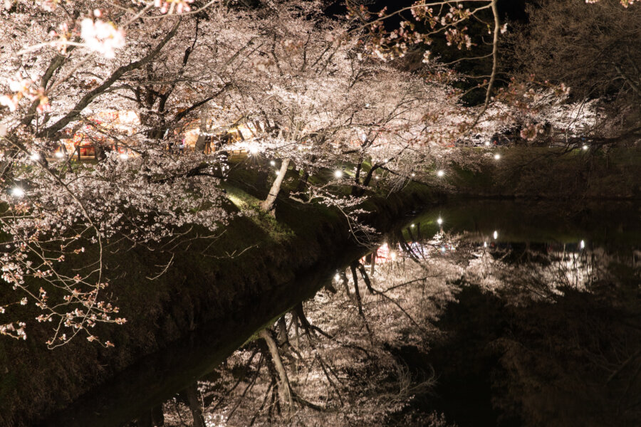 お堀を囲む桜が照らされる演出で、公式でも「日本夜景遺産に認定された美しい風景」と紹介されています。