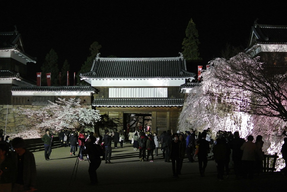 夜桜でまず狙いたいのは、東虎口櫓門前、北櫓前の枝垂れ桜、南櫓前のソメイヨシノ、そしてお堀沿いです。